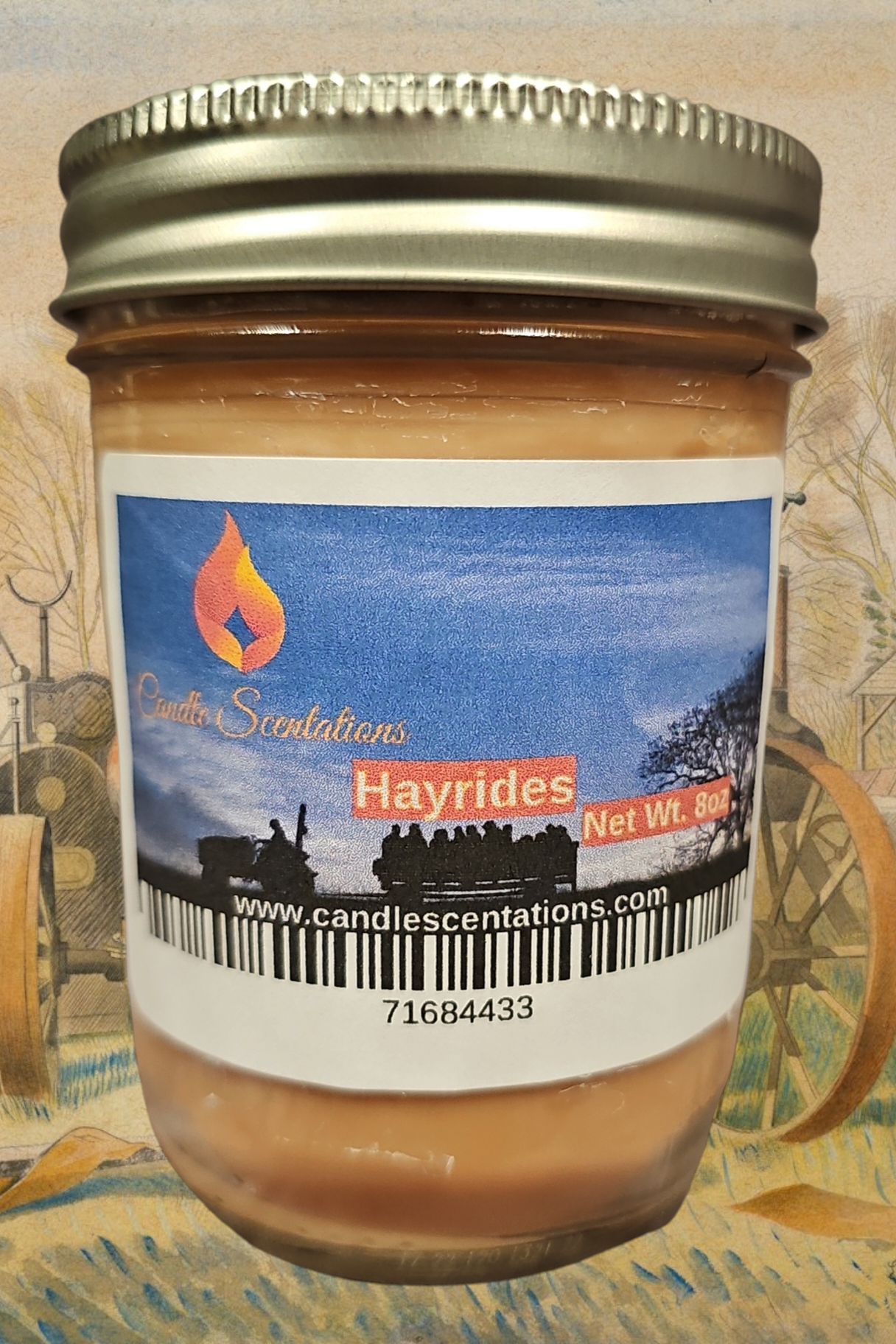 Enjoy the pleasant fragrances of fall with our Hayride 8oz. Candle. This long-lasting candle features inviting scents of Hayride, teal pumpkin, spiced vanilla, green cardamom, fall air, and sandalwood. Perfect for any season, this candle is sure to fill your home with the enchanting aromas of the season.