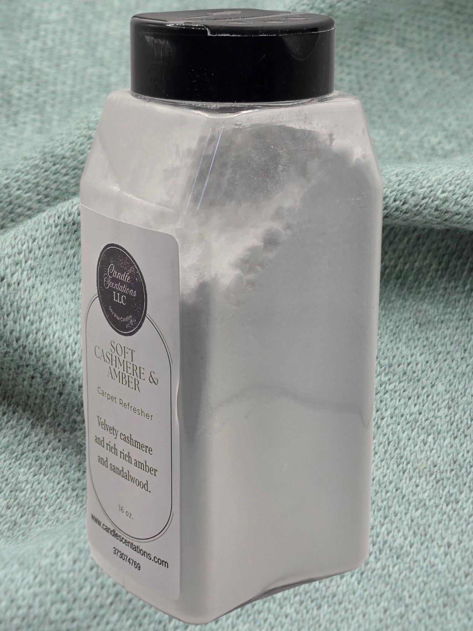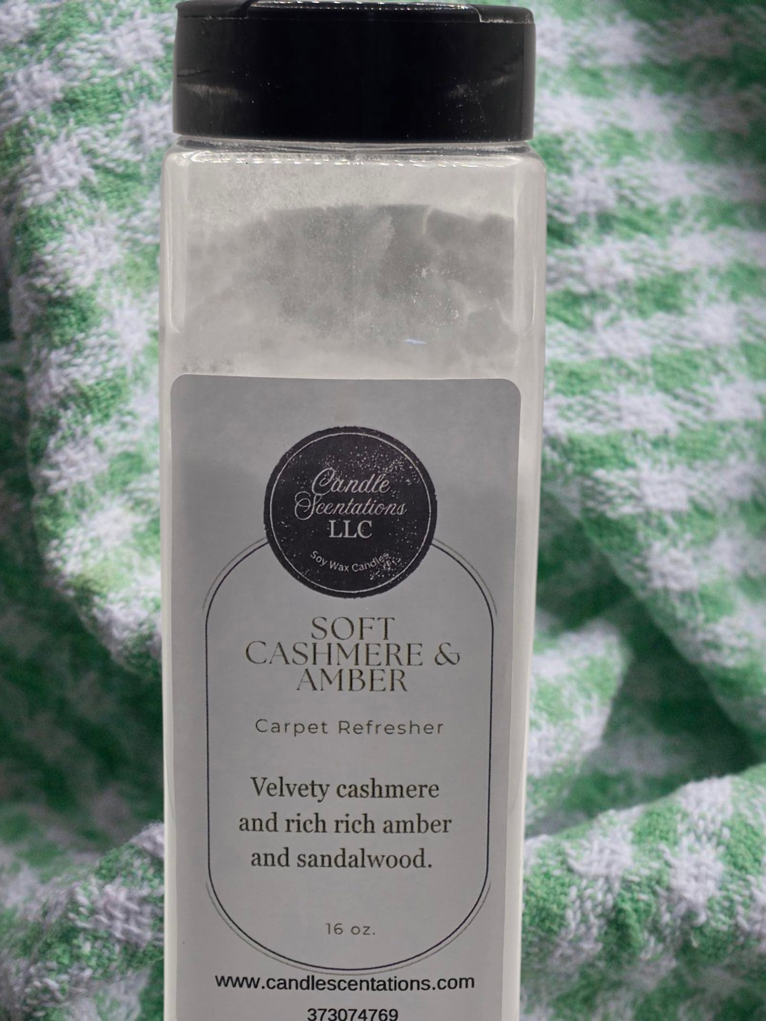 Elevate your living space with our Soft Cashmere & Amber 16 oz. Carpet Refreshers. This refined blend of velvety cashmere, warm amber, and creamy sandalwood effortlessly revitalizes carpets, leaving a subtle, luxurious fragrance. Perfect for adding an inviting, elegant touch to your home environment.