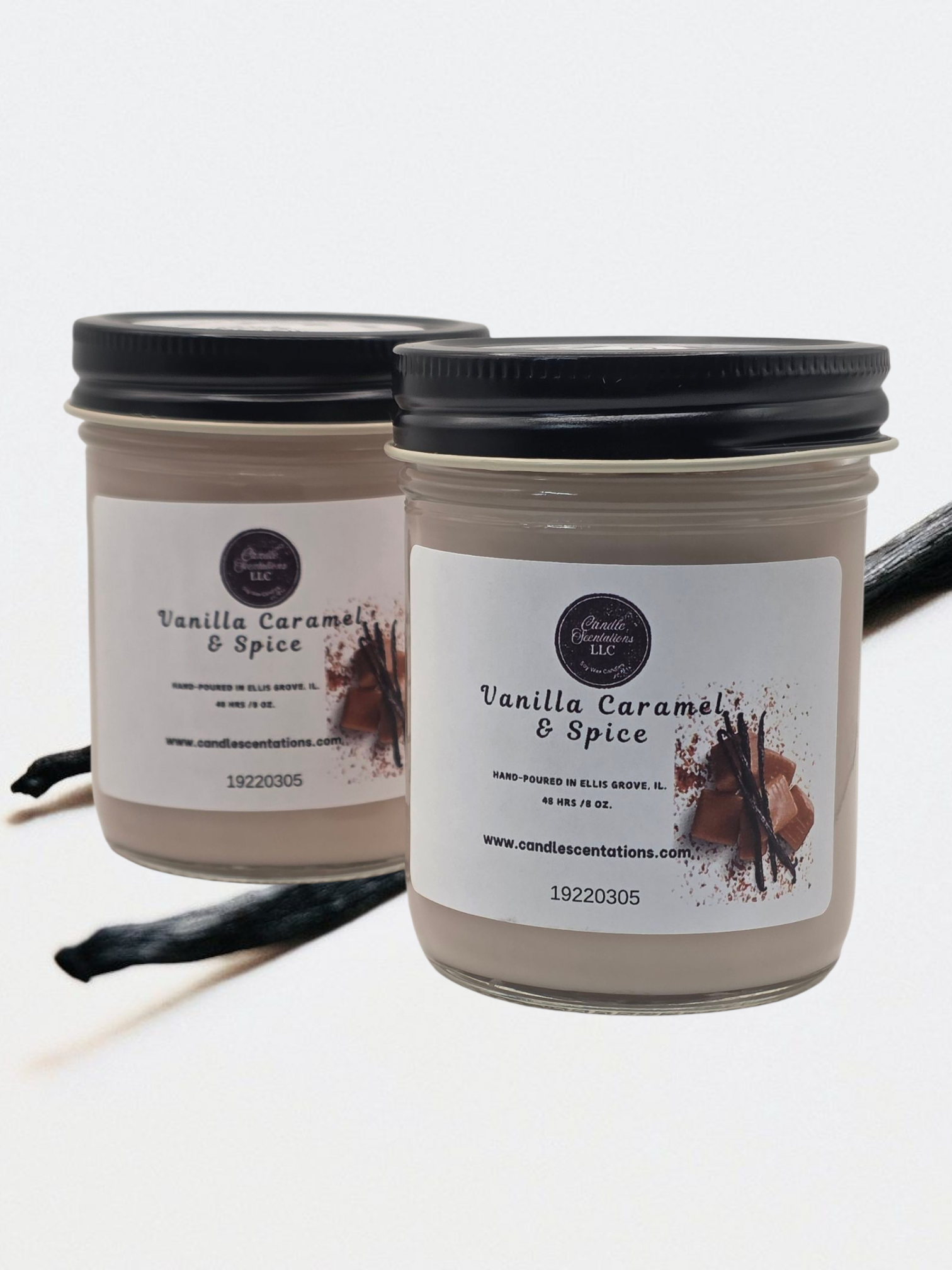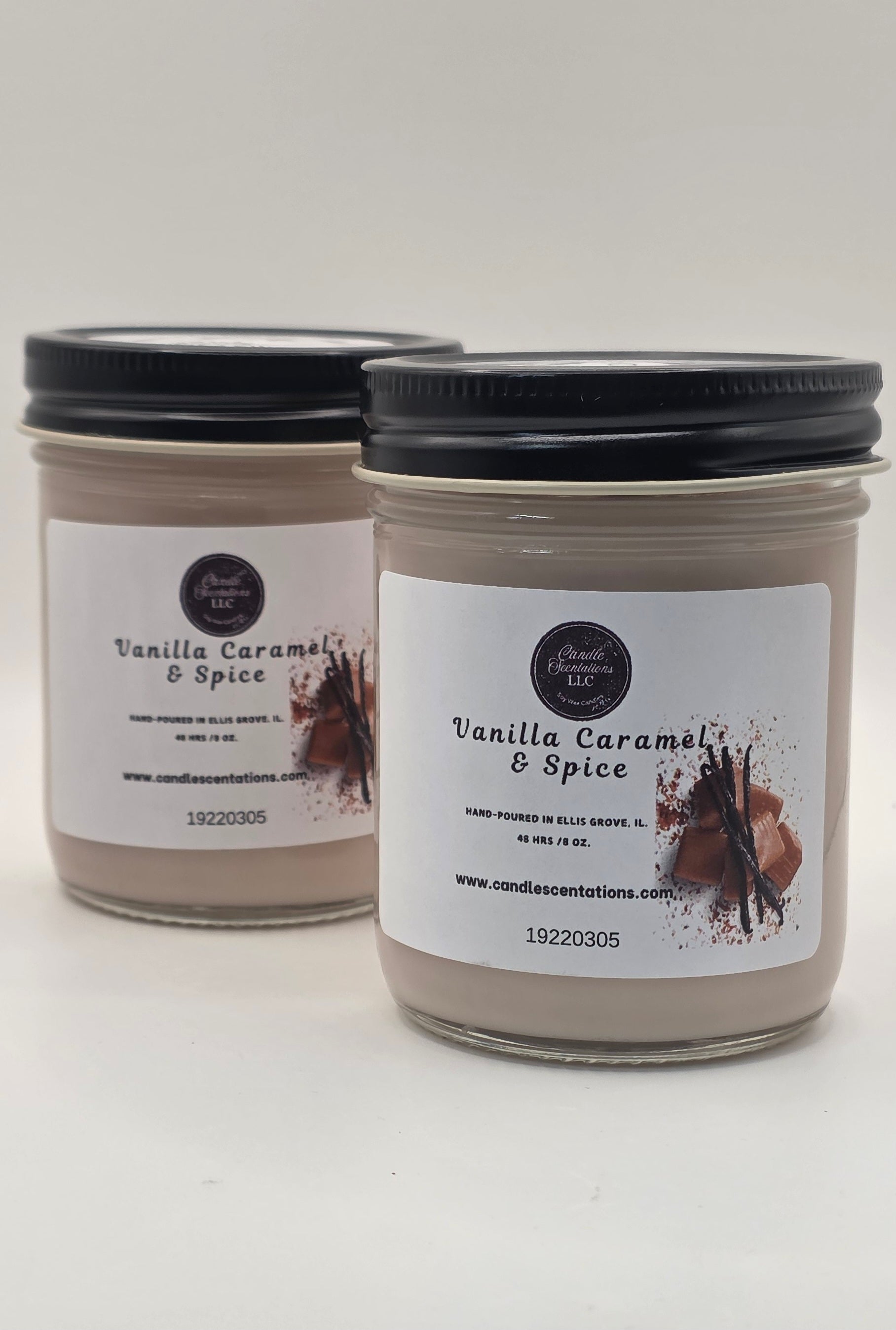 Enjoy the sweet aroma of vanilla caramel & spice with this 8 oz. candle. Carefully crafted with natural wax and quality fragrance oil, it will fill your home with a delightful scent. Perfect as a gift or for your own enjoyment.