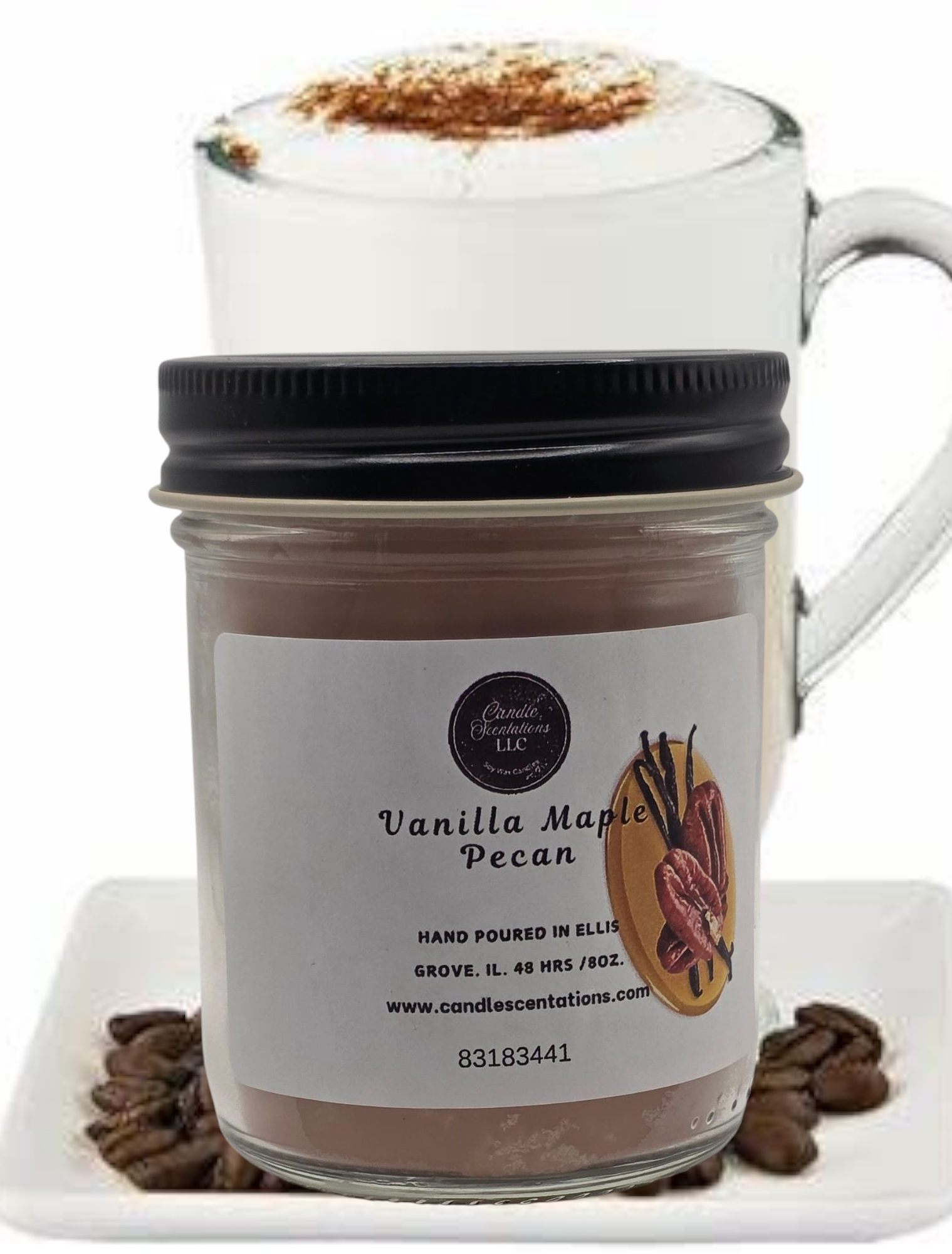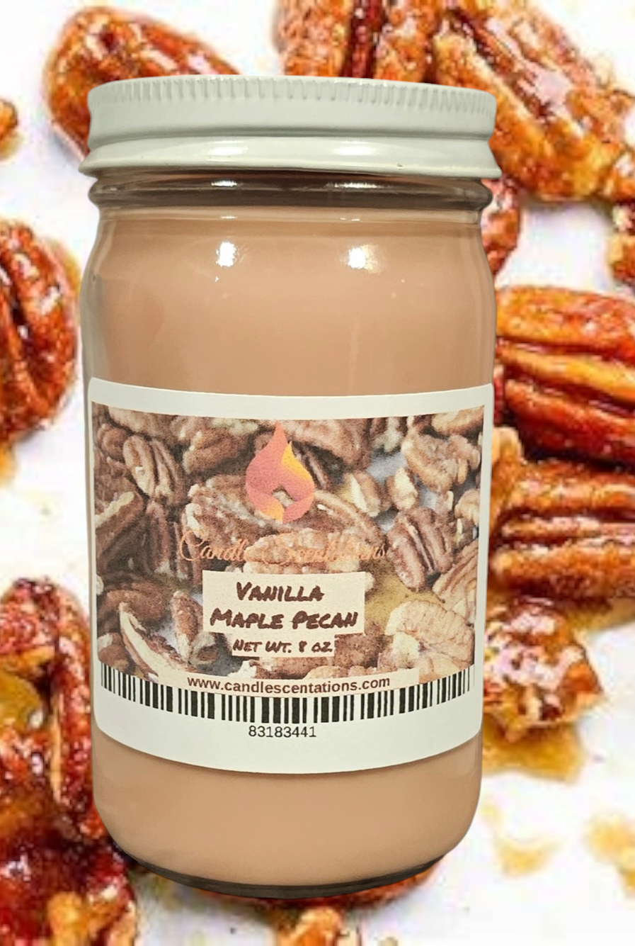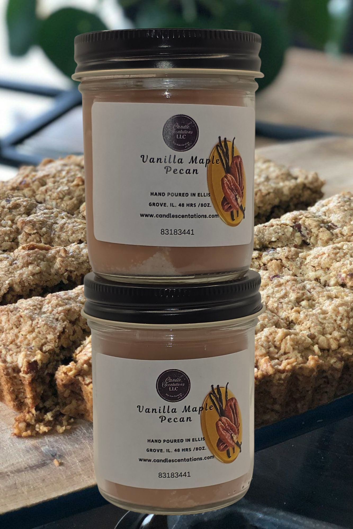 This 8oz. Vanilla Maple Pecan Candle features a nutty bouquet composed of coconut, peach, cherry flower, pink hawthorn, clove, and a sweet syrup. Enjoy a gentle combination of rich, comforting aromas in your home.